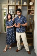 This Navy-Blue Printed couple matching outfit includes a women?s flowy cotton midi dress and a men?s short-sleeve printed shirt. Designed with cheerful yellow floral prints, this set is perfect for summer outings, casual gatherings, or twinning on vacations.